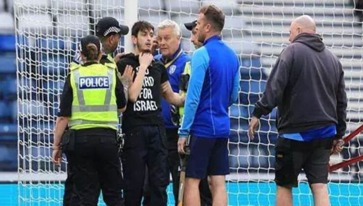 İskoçya ile İsrail arasında oynanan Avrupa Kadınlar Futbol Şampiyonası (EURO 2025) eleme maçı sırasında, “İsrail’e Kırmızı Kart” yazılı tişört giyen Filistin destekçisi bir kişi, kendini kale direğine zincirledi.