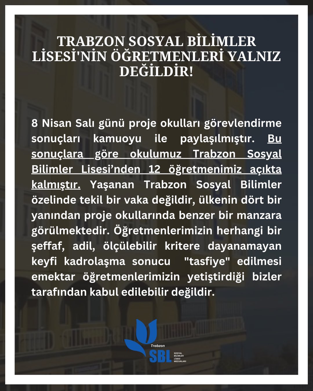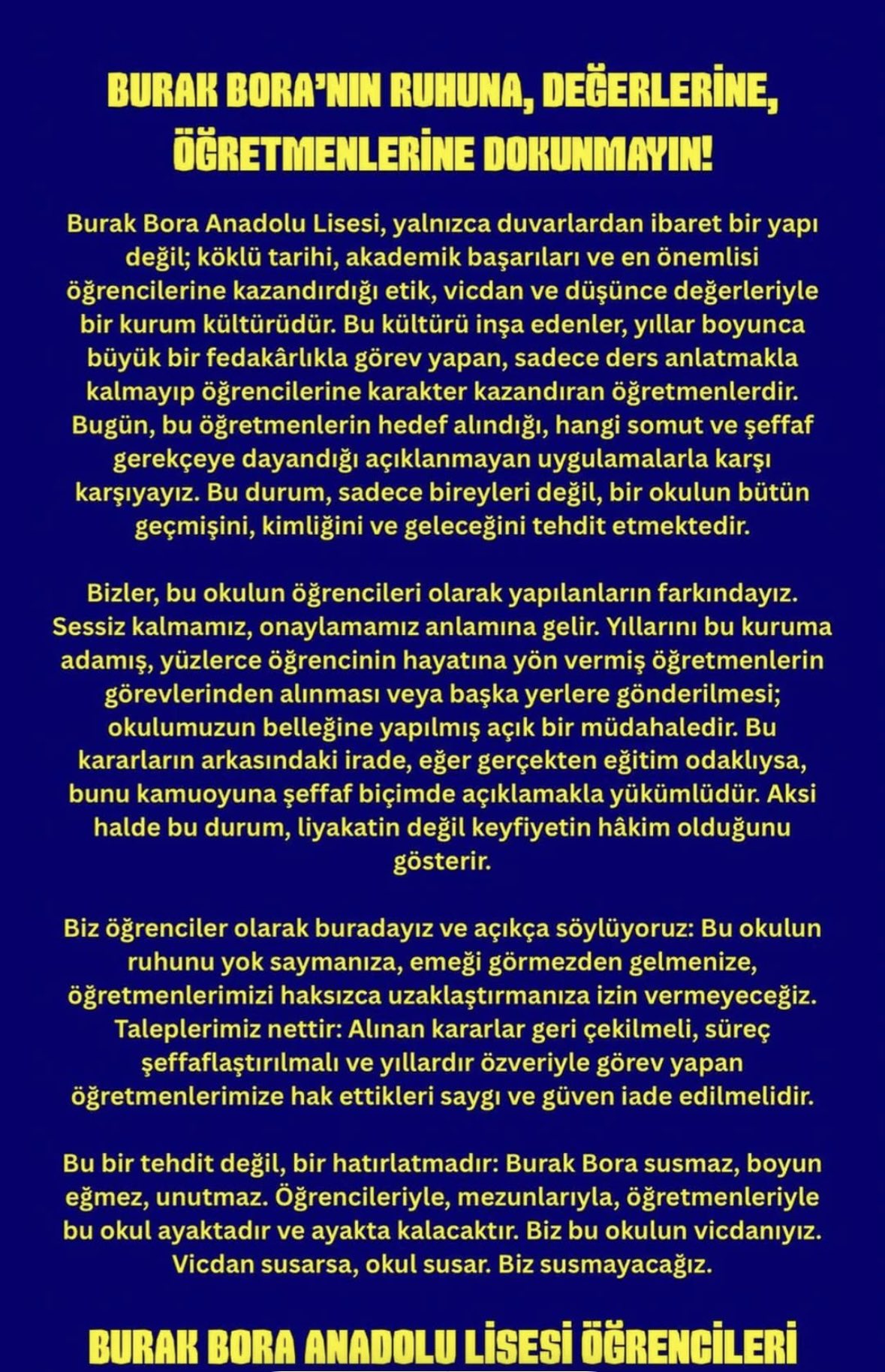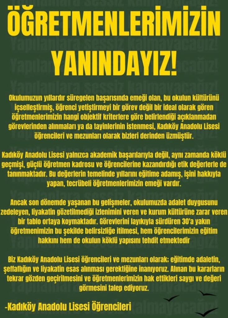 Şehremini Anadolu Lisesi öğrencileri ve mezunları okullarında uzun yıllar görev alan öğretmenlerinin sürfgün edilmesine karşı bir bildiri yayınladı.