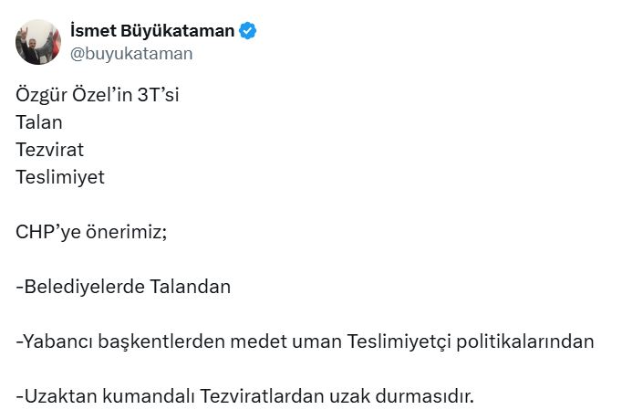“Özgür Özel’in 3T’si talan, tezvirat, teslimiyet… CHP’ye önerimiz; belediyelerde talandan, yabancı başkentlerden medet uman teslimiyetçi politikalarından, uzaktan kumandalı tezviratlardan uzak durmasıdır.”